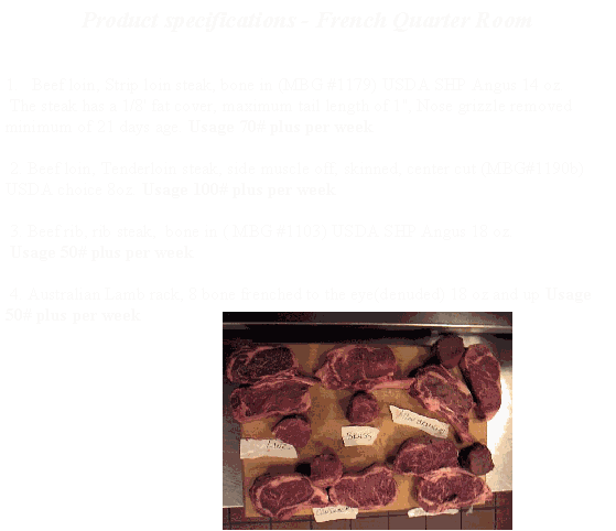 On November 28 we conducted a meat cutting to compare reputable vendors for our French Quarter room. Our purpose was to establish specific specifications and find the best vendor for our needs. This cutting was documented from packaging to consumption . We attempted to show all of the products grouped by vendor. I feel that this web site will give everyone a good idea of what happened.
