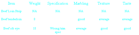 Bruss did not have the bone in New York strip steak available for the cutting. We did cut the items that they did bring us. I would like to comment on Bruss's packaging, The fillet was compressed square and the Beef rib steak was not sealed at all. When I requested the pricing from Bruss they replied that they could not be competitive unless they serviced more that one unit.
